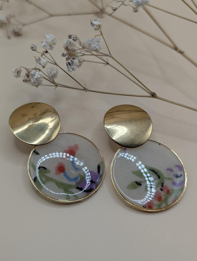 Boucle d'oreilles. Chutes tissus incluses dans de la résine. Support en acier inoxydable doré à l'or fin.